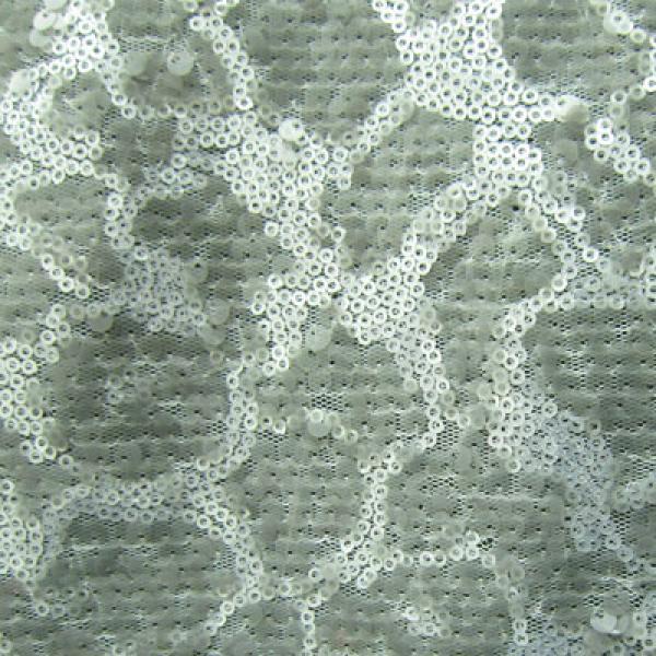 This is a Medium-Weight Sequins on Mesh Fabric, With a 2 Way Stretch, Silver/Gray Colored