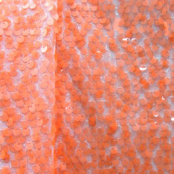 This is a Medium-Weight Sequins on Mesh on Stretch Mesh Fabric, With a 2 Way Stretch, Orange/White Colored