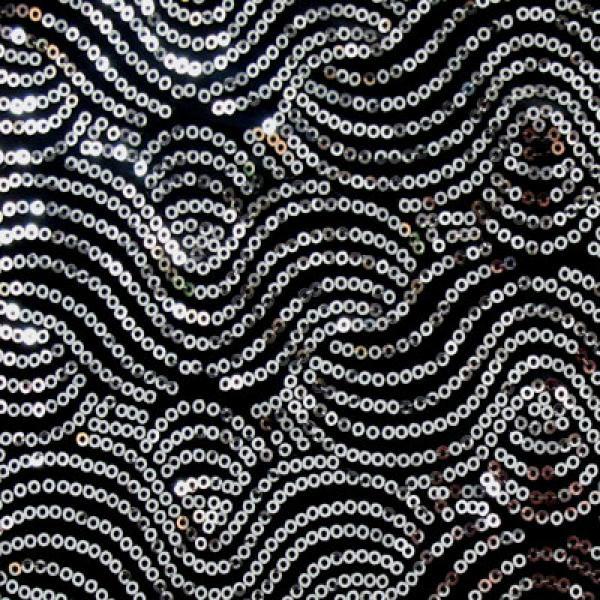 This is a Medium-Weight Shiny Fancy 2mm Sequins on Polyester Spandex Fabric, With a 2 Way Stretch, Silver/Black Colored