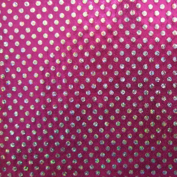 This is a Medium-Weight Shiny Holographic Metallic Foil on Nylon Spandex Fabric, With a Stretch, Silver/Fuchsia Colored