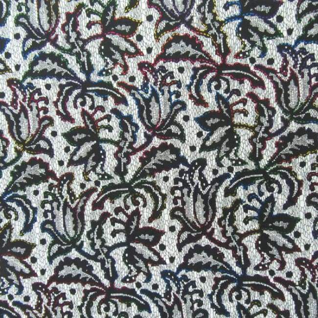 This is a Medium-Weight Shiny Metallic Floral Outline Foil Print on Polyester Spandex Fabric, With a 2 Way Stretch, Multi-Colored Colored