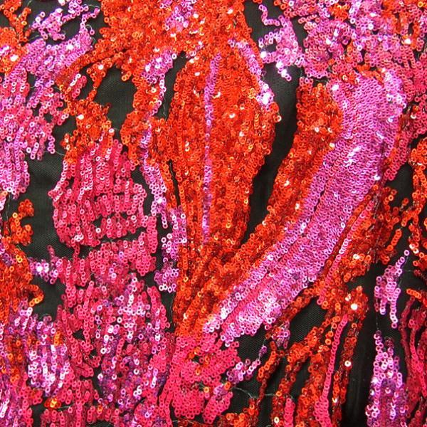 This is a Medium-Weight Shiny Sequins on Stretch Mesh Fabric, With a Non-Stretch, Red/Pink Colored