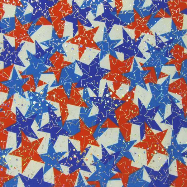 This is a Shiny Stars Metallic Foil on Polyester Spandex, 4 Way Stretch, Red/White/Silver Made from Polyester Spandex