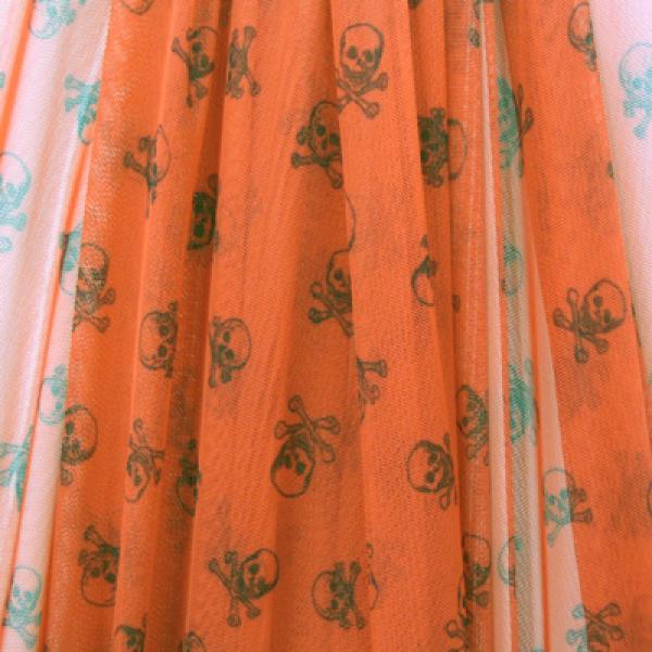 This is a Light-Weight Skull Print Mesh on Nylon Mesh Fabric, With a 2 Way Stretch, Orange Colored