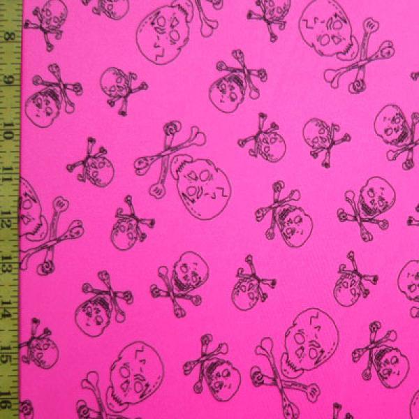 This is a Light-Weight Skull Print on Mesh Fabric, With a 4 Way Stretch, Neon Pink Colored