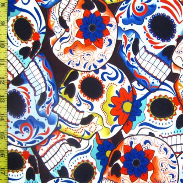 This is a Light-Weight Skulls Print on Polyester Spandex Fabric, With a 4 Way Stretch, Multi-Colored Colored