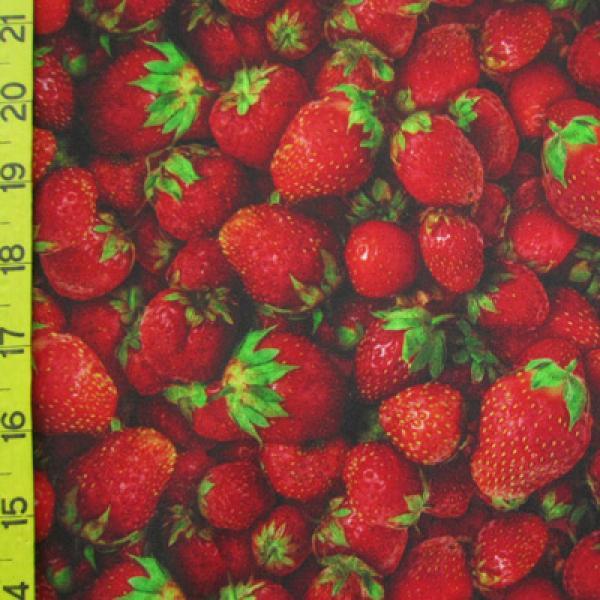 This is a Light-Weight Strawberry Print on Polyester Spandex Fabric, With a 4 Way Stretch, Multi-Colored Colored