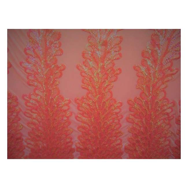 This is a Medium-Weight Three Trees Fancy 3mm Sequins on Mesh Fabric, With a Stretch, Coral Colored
