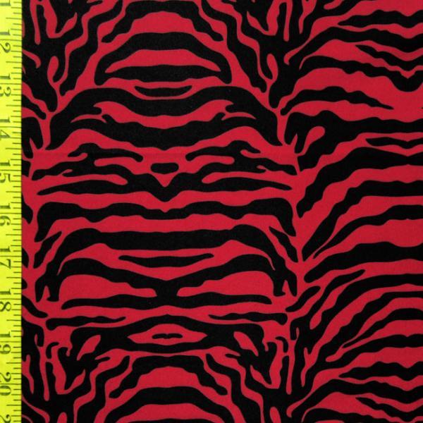 This is a Medium-Weight Tiger Print on Polyester Spandex Fabric, With a 2 Way Stretch, Red/Black Colored
