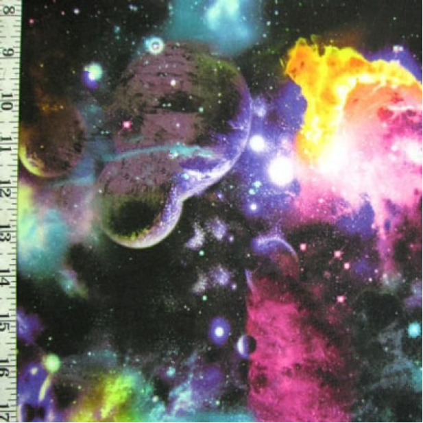 This is a Light-Weight Universe Print on Polyester Spandex Fabric, With a 4 Way Stretch, Multi-Colored Colored