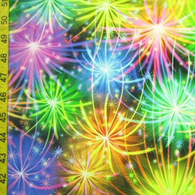This is a Light-Weight Fireworks Print on Polyester Spandex Fabric, With a 4 Way Stretch, Multi-Colored Colored