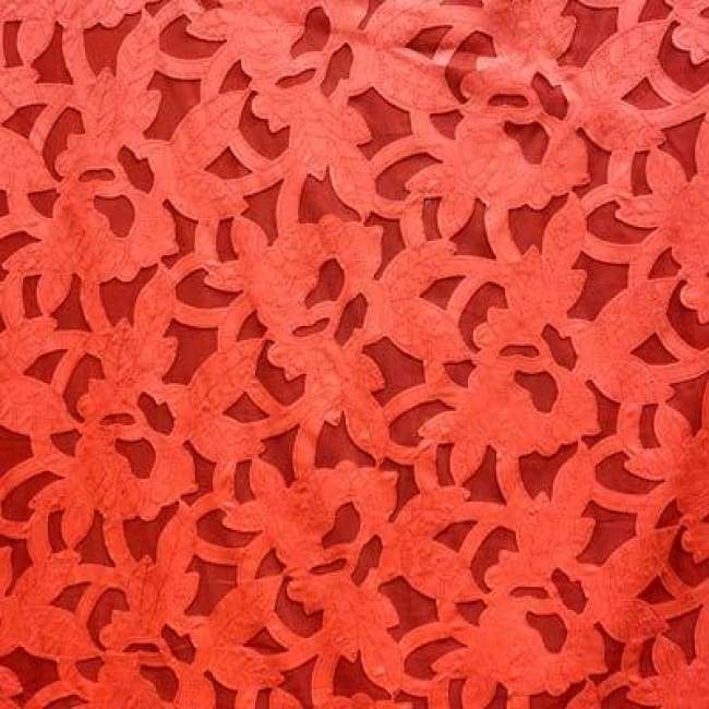 This is a Light-Weight Floral Pleather on Mesh on Polyester Mesh Fabric, With a Non-Stretch, Red Colored