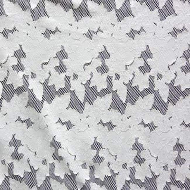 This is a Light-Weight Floral Pleather on Mesh on Polyester Mesh Fabric, With a Non-Stretch, White Colored