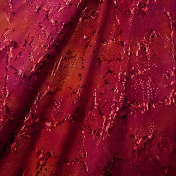 This is a Medium-Weight Holographic Seascape Metallic Foil on Nylon Spandex Fabric, With a 4 Way Stretch, Red Colored