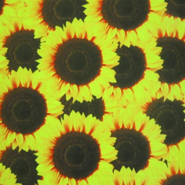 This is a Light-Weight Sunflowers Print on Polyester Spandex Fabric, With a 4 Way Stretch, Multi-Colored Colored