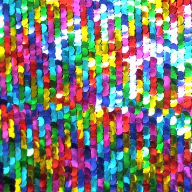 This is a Medium-Weight Colorful Sequins on Stretch Mesh Fabric, With a 2 Way Stretch, Rainbow Colored