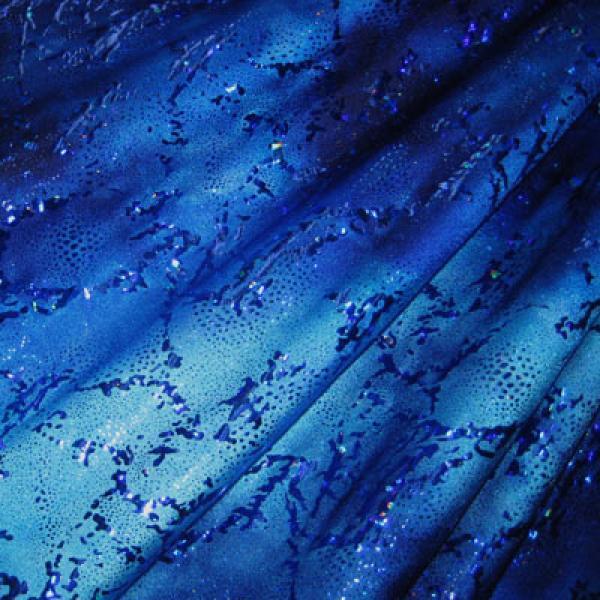 This is a Medium-Weight Holographic Seascape Metallic Foil on Nylon Spandex Fabric, With a 4 Way Stretch, Royal Blue Colored