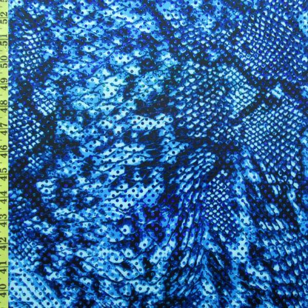 This is a Medium-Weight Holographic Snake Print Sequin on Polyester Spandex Fabric, With a 4 Way Stretch, Blue Colored