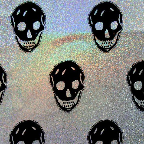 This is a Medium-Weight Shiny Holographic Skulls Print on Nylon Spandex Fabric, With a 4 Way Stretch, Silver/White Colored