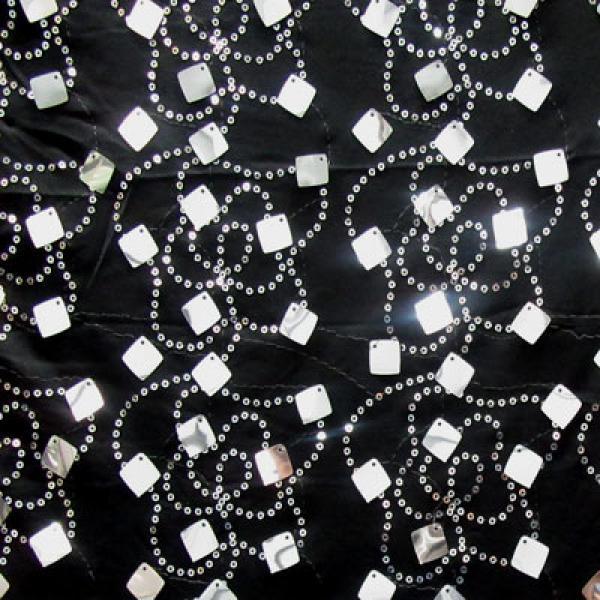 This is a Medium-Weight Shiny Sequins on Polyester Spandex Fabric, With a 2 Way Stretch, Silver/Black Colored