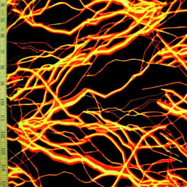 This is a Medium-Weight Thunderstorms Print on Nylon Spandex Fabric, With a 4 Way Stretch, Yellow/Orange Colored